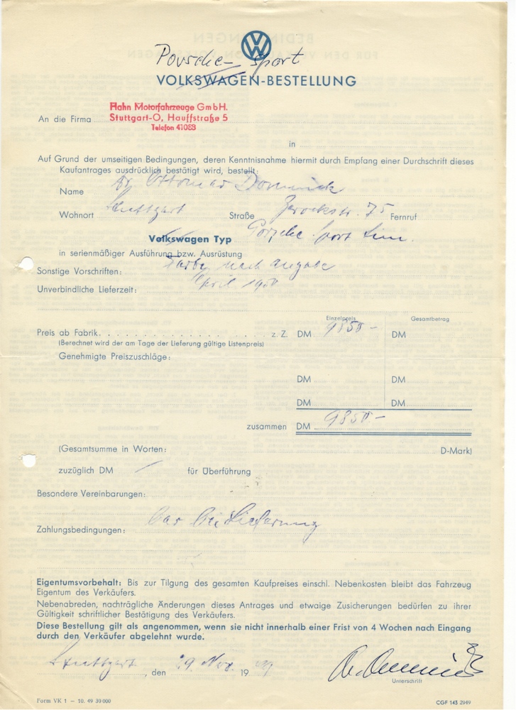 Fundacja Domnicka, która zarządza jego majątkiem, nadal ma oryginalny formularz zamówienia od Ottomara Domnicka z numerem 5001. Zamówienie zostało obsłużone przez dealera Volkswagena o nazwie Hahn, ponieważ w Niemczech nie było wówczas sieci sprzedaży Porsche. Napis „Volkswagen” na formularzu zamówienia został przekreślony ręcznie i zastąpiony słowami „Porsche-Sport”. Do dziś Porsche 356 Ottomara Domnicka reprezentuje początek Porsche w Niemczech, a także stanowi bezpośrednie rozpoczęcie fabrycznych odbiorów w Zuffenhausen.