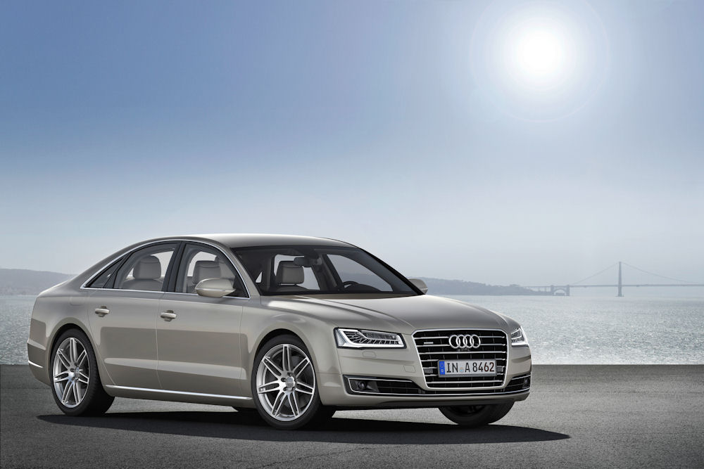 Dynamiczna stylistyka Audi A8 jest teraz jeszcze bardziej wyrazista. Maska silnika, pojedynczo obramowana osłona chłodnicy Singleframe i zderzak mają mocniej zarysowane kontury, a reflektory wydają się bardziej płaskie. Na życzenie, Audi wyposaża swą największą limuzynę w innowacyjne diodowe reflektory Matrix LED. Jednostki świateł drogowych składają się w nich z 25 diod świetlnych, które zapalają się pojedynczo, zależnie od sytuacji, a które można również w zależności od potrzeb wyłączać lub przyciemniać. Dzięki takiemu rozwiązaniu, system oświetlenia drogi może bardzo precyzyjnie reagować na nadjeżdżające z naprzeciwka lub jadące przed nami pojazdy. Nie oślepia ich, równocześnie zawsze we właściwy sposób oświetlając tor jazdy. Światła tylne samochodu także zostały przeprojektowane i przebudowane.